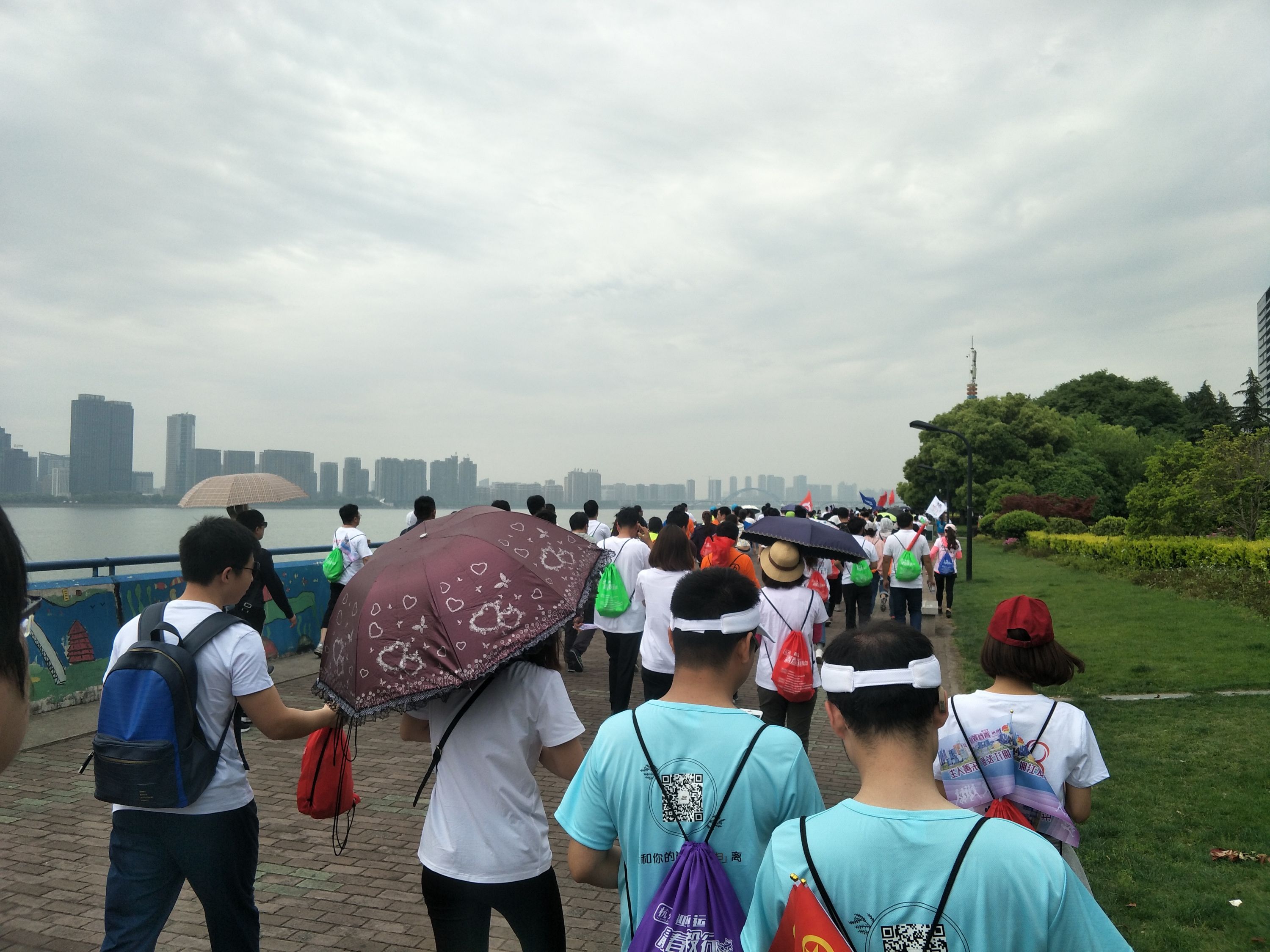 上午9:00,随着主持人一声令下,来自杭州各个单位、部门的5000余人排成整齐的队伍,雄赳赳气昂昂的走出会场,从钱江新城城市阳台出发,沿着钱塘江北岸观光人行道一路向西,到复兴大桥北端返回,全程10km,沿途经过五个扫码签到点,完成5个点的扫码签到即视为完成任务。